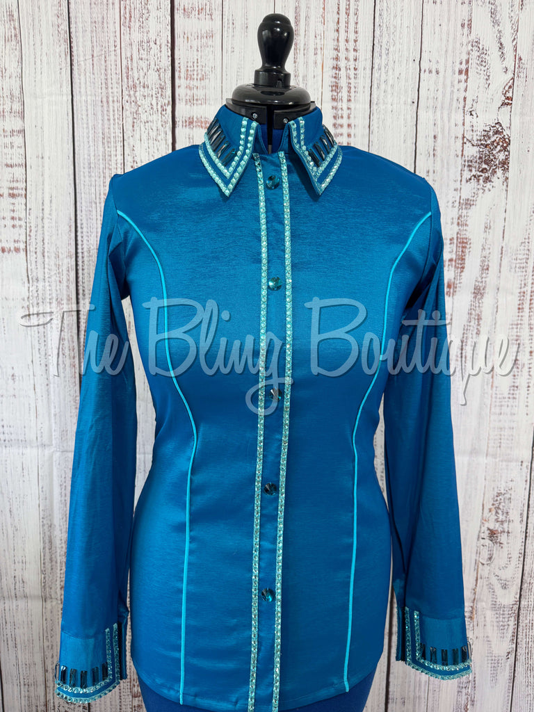 The shirts are made from a stretch taffeta base and are accented with high quality glass crystals that sparkle from every direction.