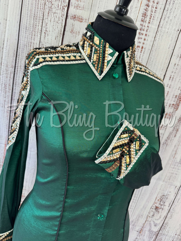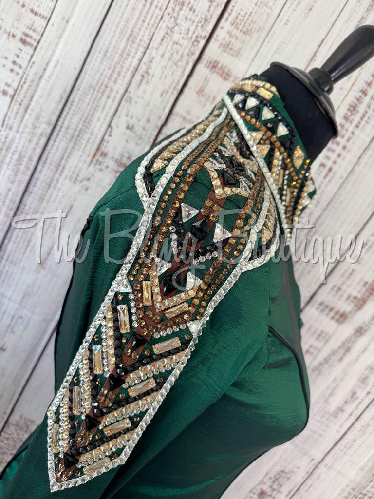 This gorgeous day shirt is absolutely stunning in person! The shirt is made from a stretch taffeta fabric and is covered in the highest quality of crystals that sparkle from every direction.