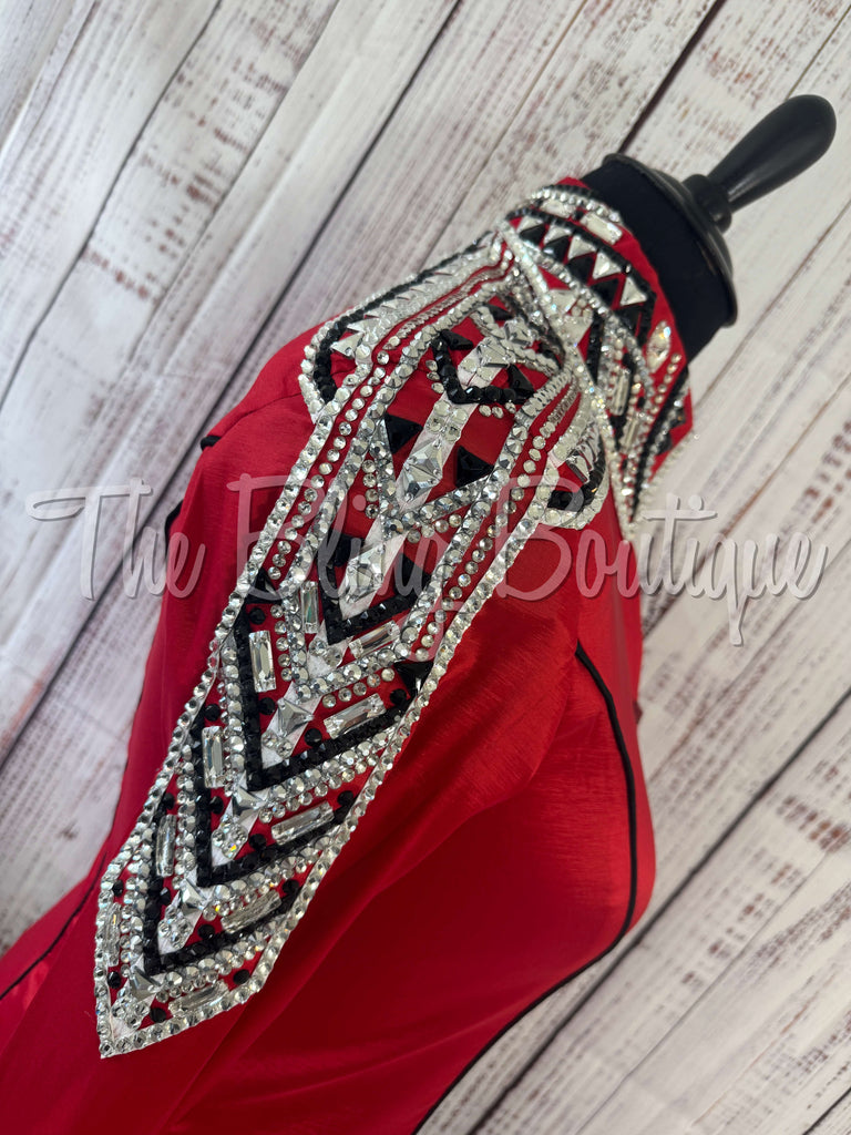This gorgeous day shirt is absolutely stunning in person! The shirt is made from a stretch taffeta fabric and is covered in the highest quality of crystals that sparkle from every direction.