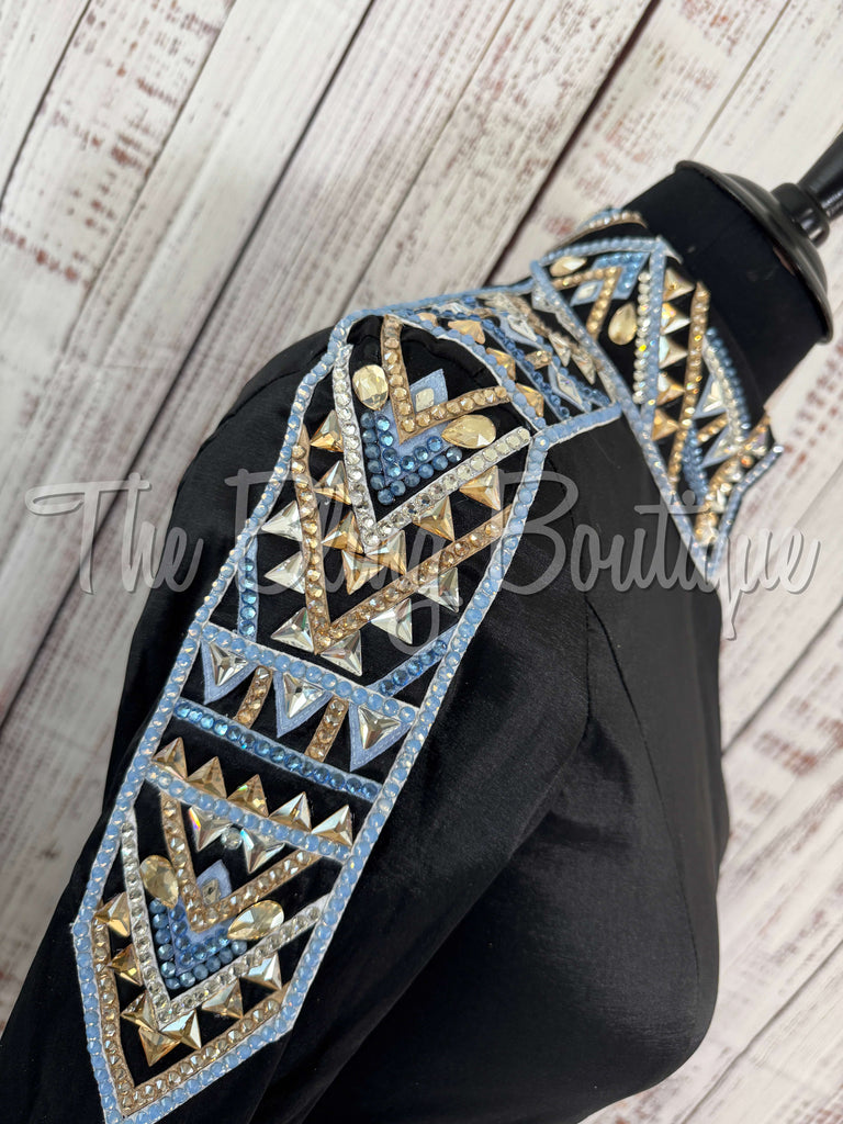 This gorgeous day shirt is absolutely stunning in person! The shirt is made from a stretch taffeta base and is covered in the highest quality of crystals that sparkle from every direction.