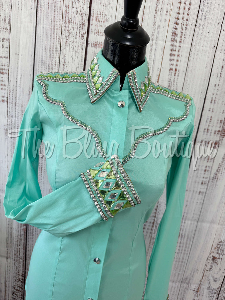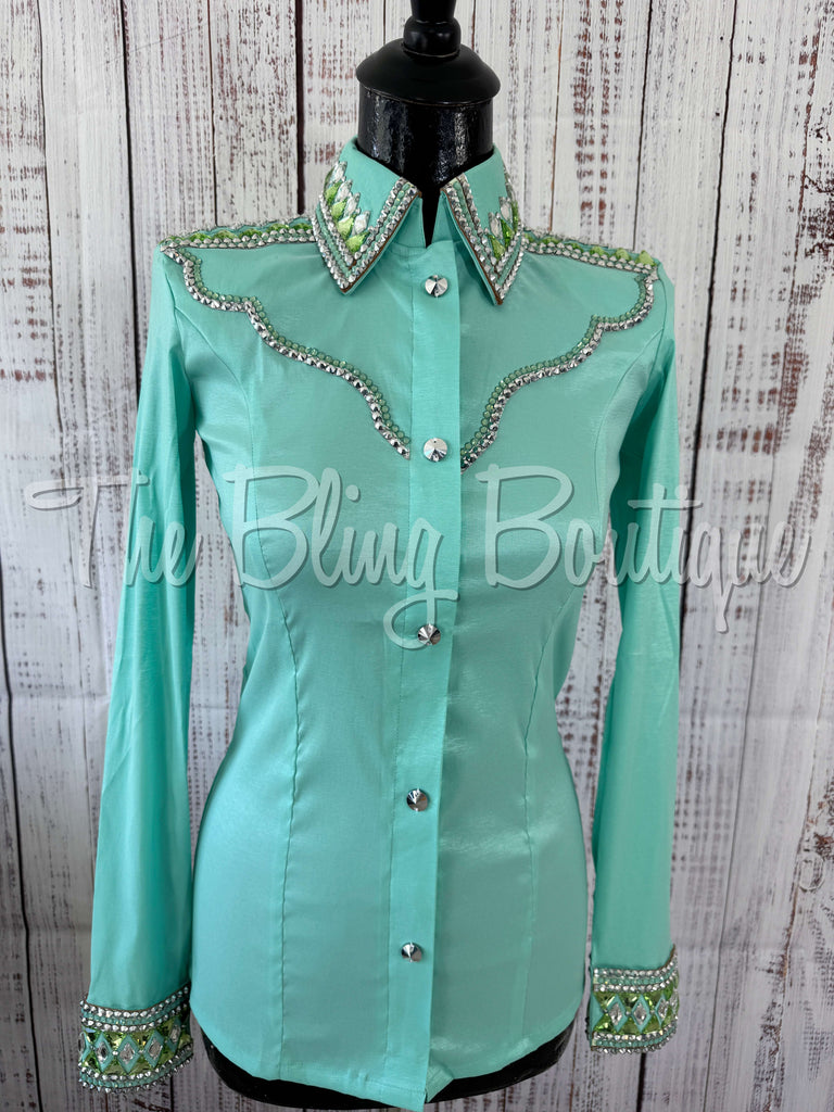 This gorgeous day shirt is absolutely stunning in person! The shirt is made from stretch taffeta base and is covered in the highest quality of crystals that sparkle from every direction.