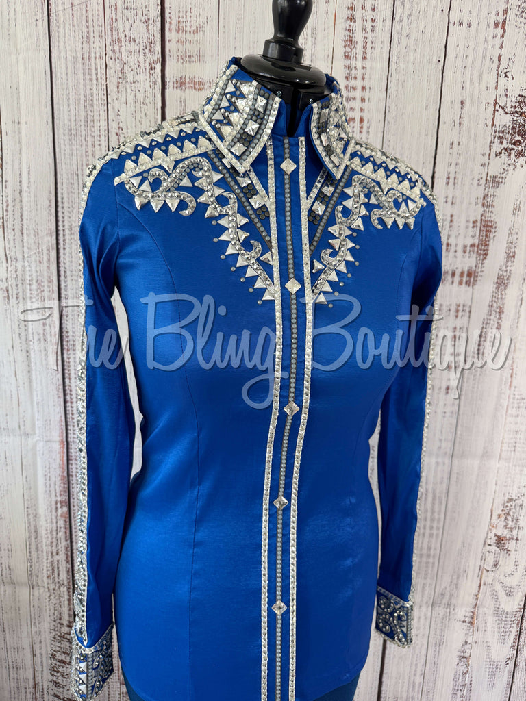 This gorgeous day shirt is absolutely stunning in person! The shirt is made from stretch taffeta base and is covered in the highest quality of crystals that sparkle from every direction.