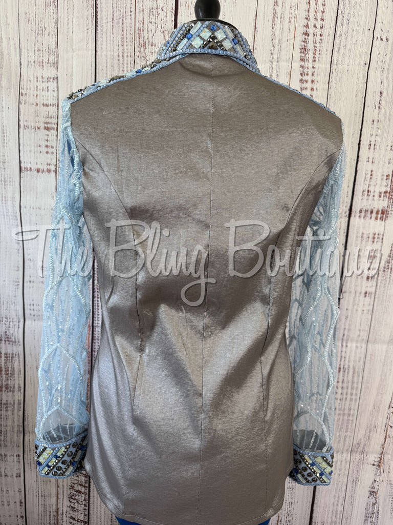 This gorgeous day shirt is absolutely stunning in person! The shirt is made from a stretch taffeta fabric and is covered in the highest quality of crystals that sparkle from every direction. This beautiful shirt features sheer lace sleeves that are perfect for the hot summer shows!