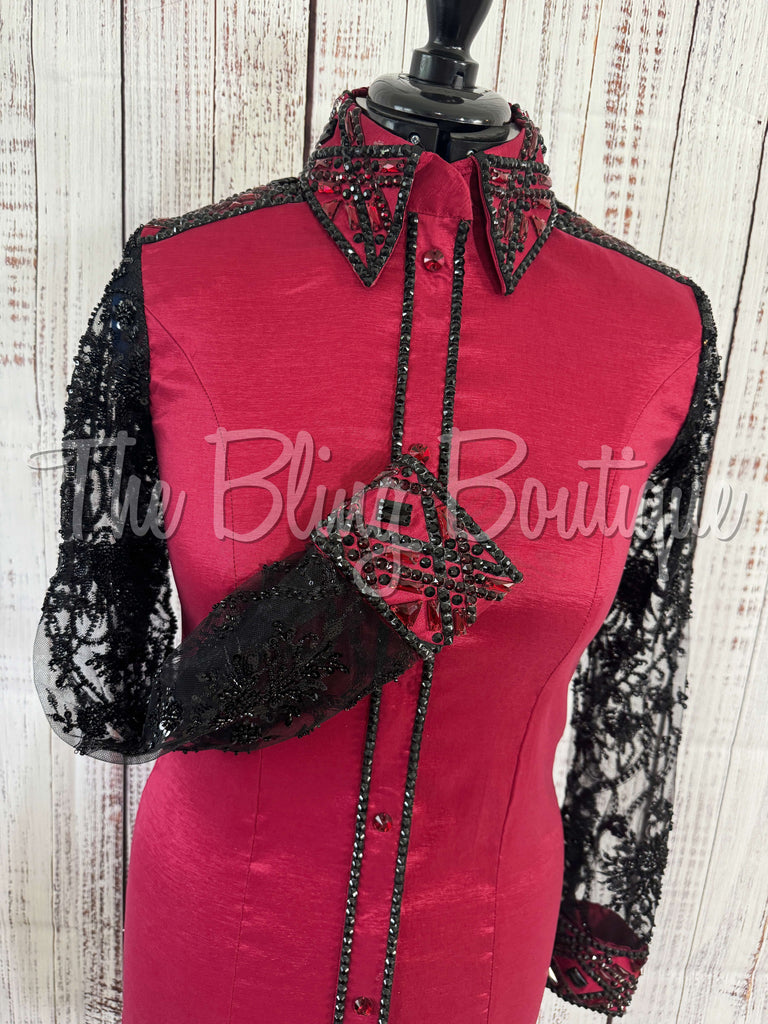 Red & Black Day Shirt Set With Beaded Lace Sleeves (M)
