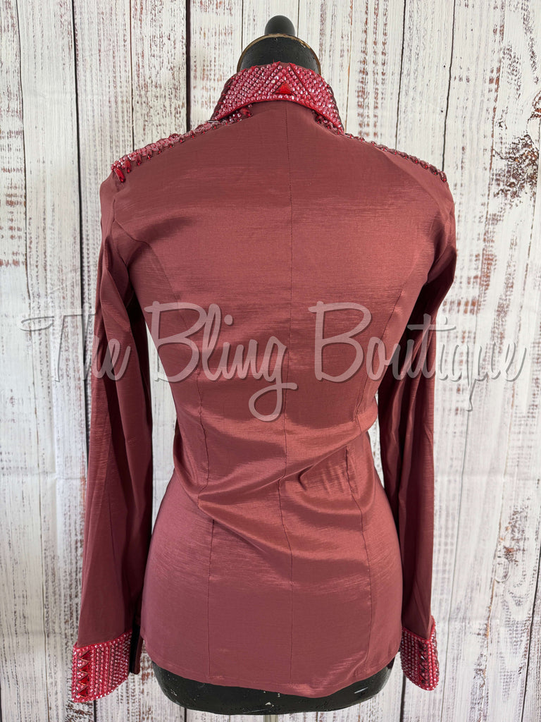 This gorgeous day shirt is absolutely stunning in person! The shirt is made from stretch taffeta base and is covered in the highest quality of crystals that sparkle from every direction.