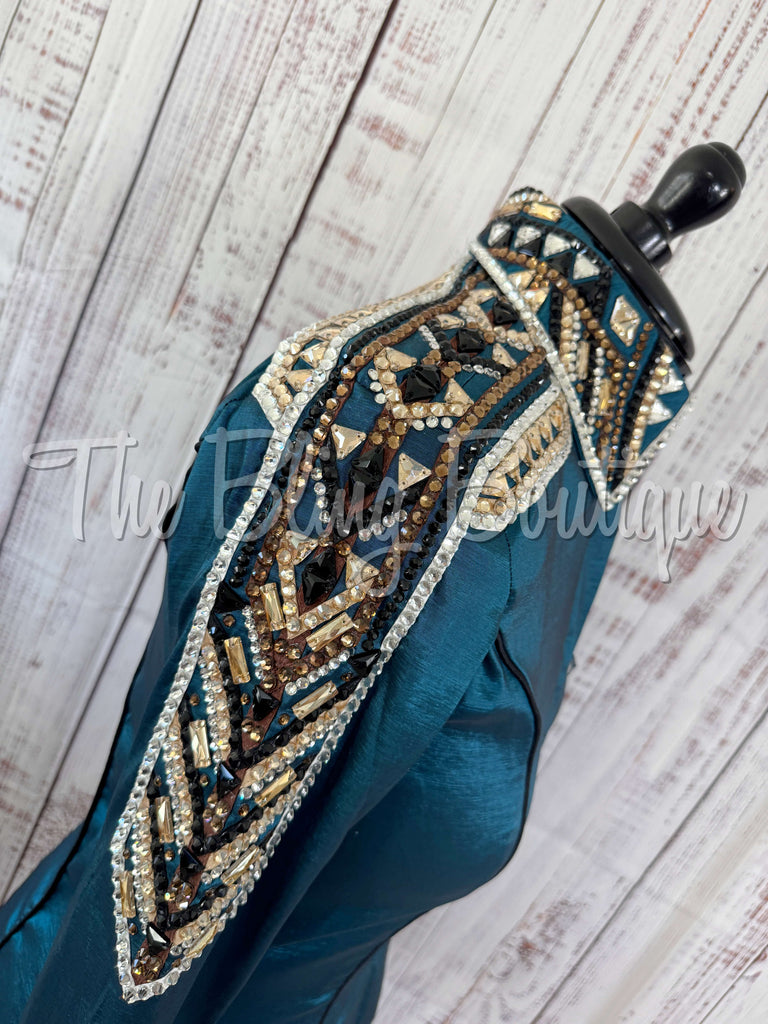 This gorgeous day shirt is absolutely stunning in person! The shirt is made from stretch taffeta base and is covered in the highest quality of crystals that sparkle from every direction.