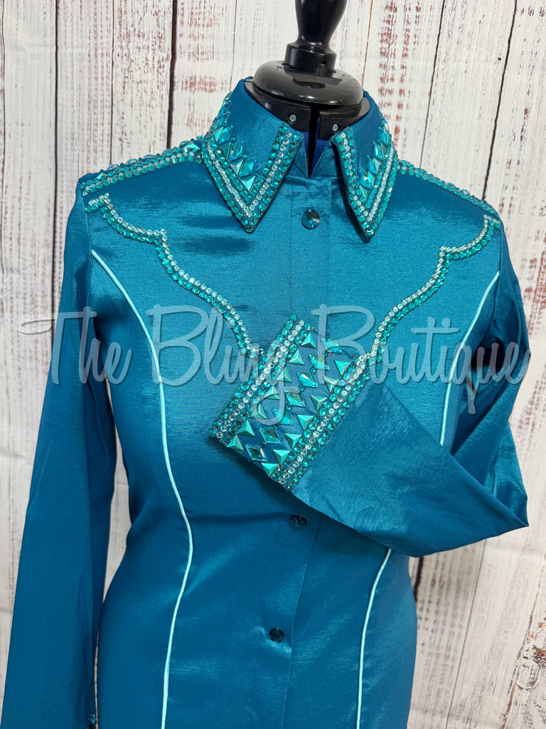 This gorgeous day shirt is absolutely stunning in person! The shirt is made from stretch taffeta base and is covered in the highest quality of crystals that sparkle from every direction.