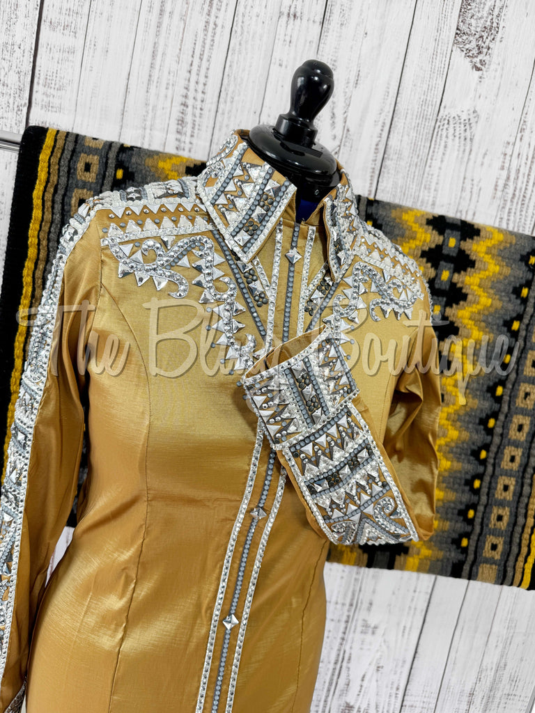 This gorgeous day shirt is absolutely stunning in person! The shirt is made from stretch taffeta base and is covered in the highest quality of crystals that sparkle from every direction.