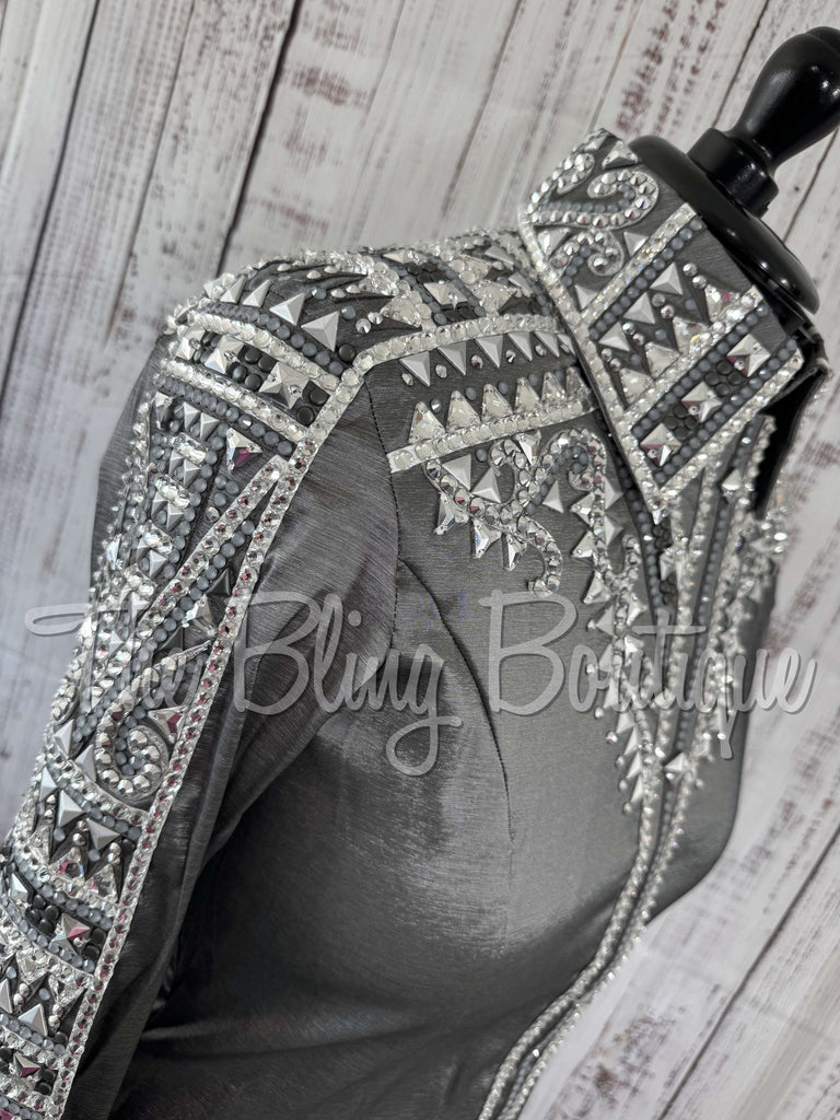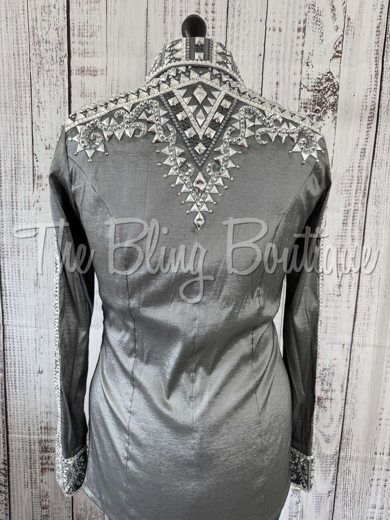 This gorgeous day shirt is absolutely stunning in person! The shirt is made from stretch taffeta base and is covered in the highest quality of crystals that sparkle from every direction.