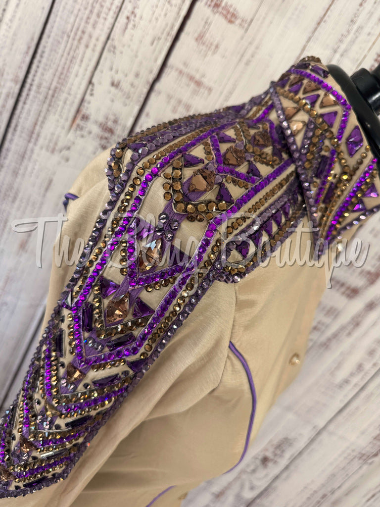 This gorgeous day shirt is absolutely stunning in person! The shirt is made from stretch taffeta base and is covered in the highest quality of crystals that sparkle from every direction.