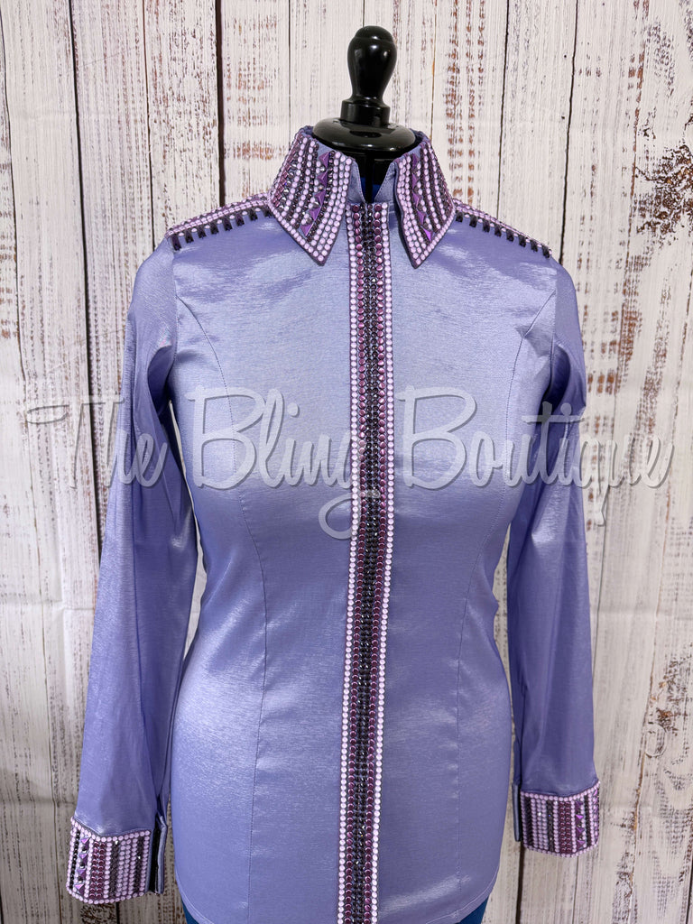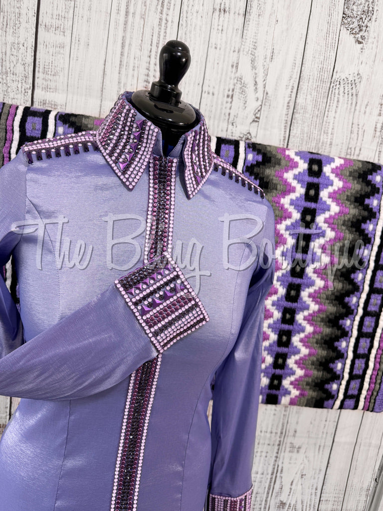 This gorgeous day shirt is absolutely stunning in person! The shirt is made from stretch taffeta base and is covered in the highest quality of crystals that sparkle from every direction.