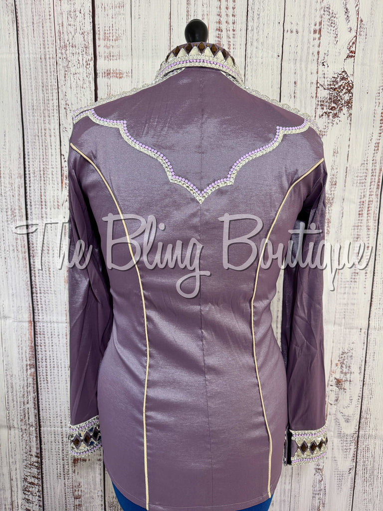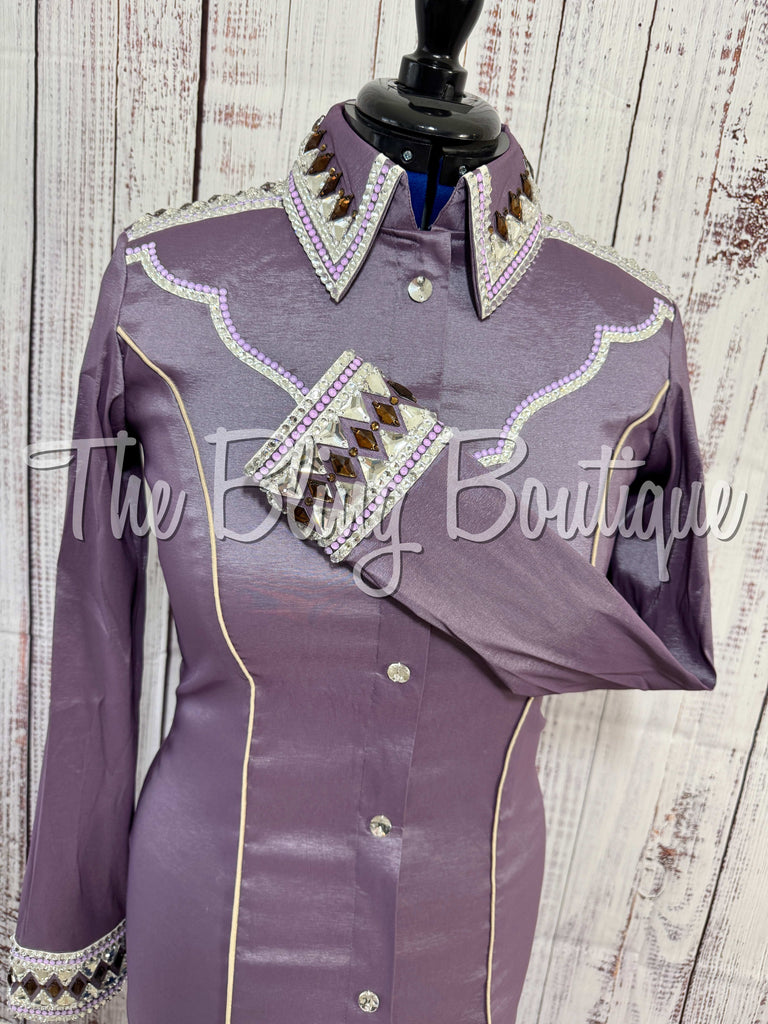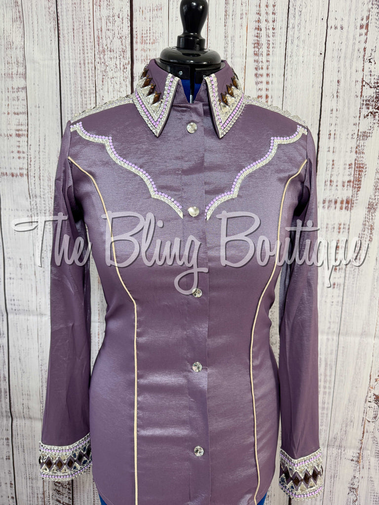 This gorgeous day shirt is absolutely stunning in person! The shirt is made from stretch taffeta base and is covered in the highest quality of crystals that sparkle from every direction.