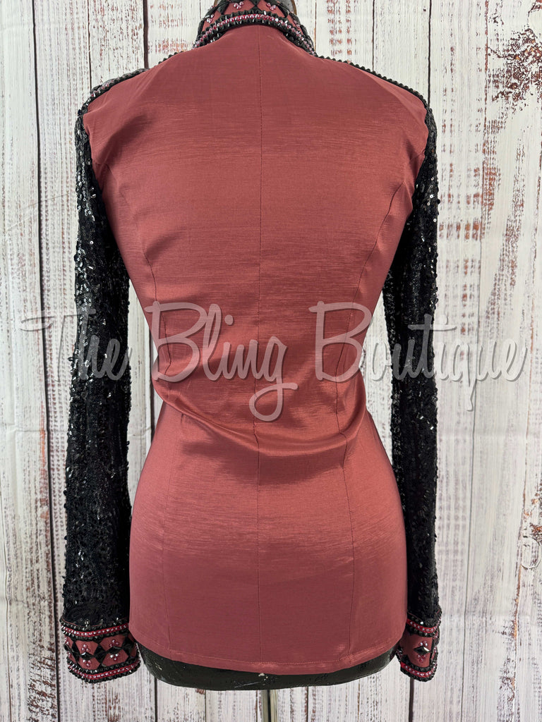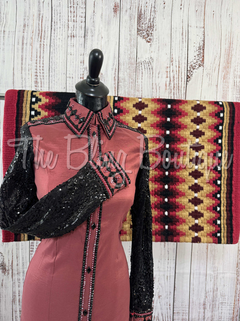 This gorgeous day shirt is absolutely stunning in person! The shirt is made from stretch taffeta base and is covered in the highest quality of crystals that sparkle from every direction. This beautiful shirt features sheer, sequin lace sleeves that are perfect for the hot summer shows!