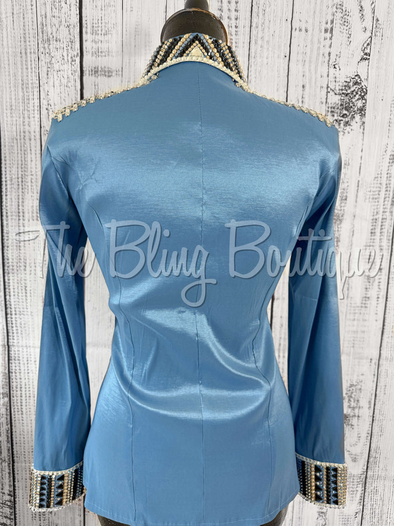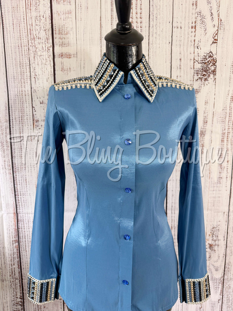 This gorgeous day shirt is absolutely stunning in person! The shirt is made from stretch taffeta base and is covered in the highest quality of crystals that sparkle from every direction.