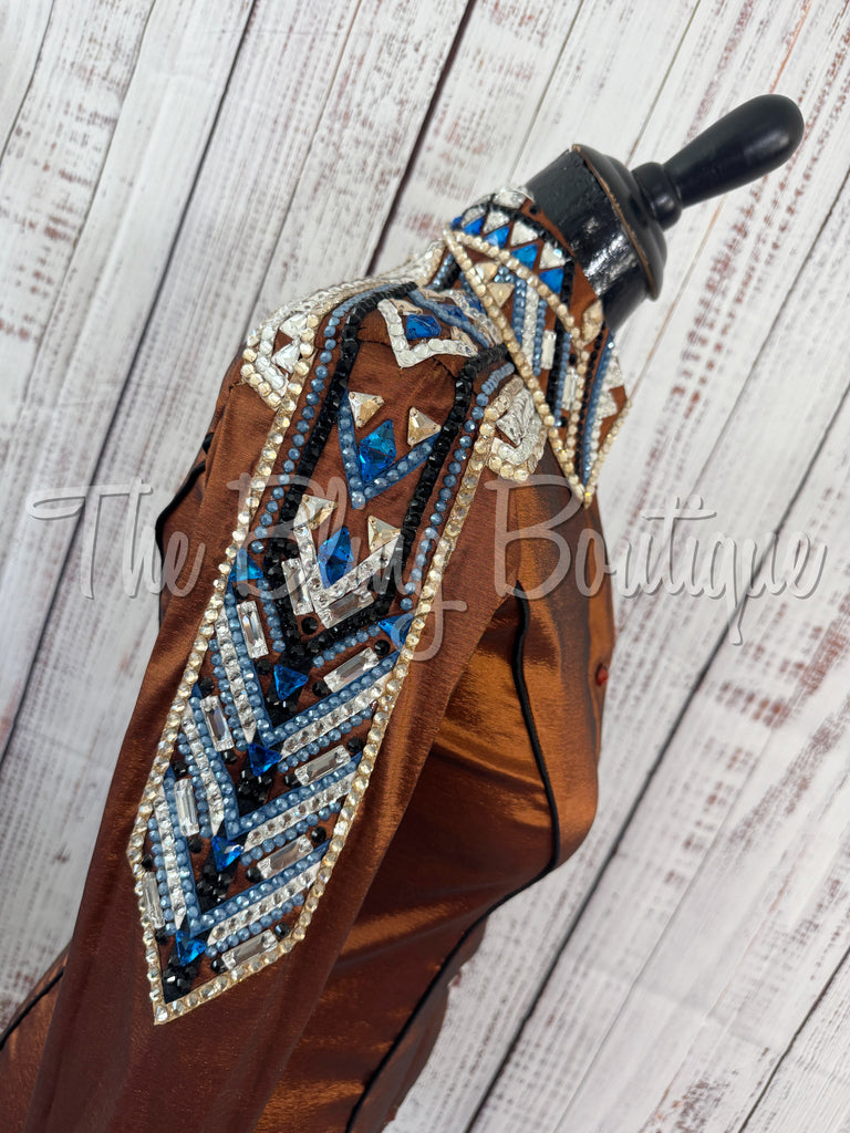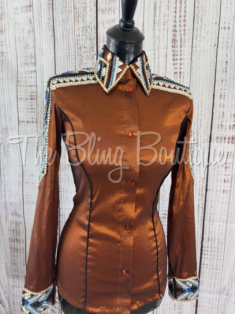 This gorgeous day shirt is absolutely stunning in person! The shirt is made from stretch taffeta base and is covered in the highest quality of crystals that sparkle from every direction.
