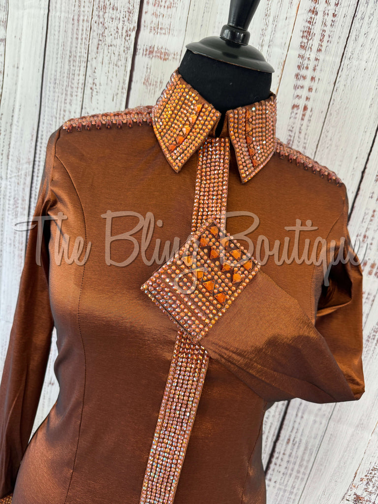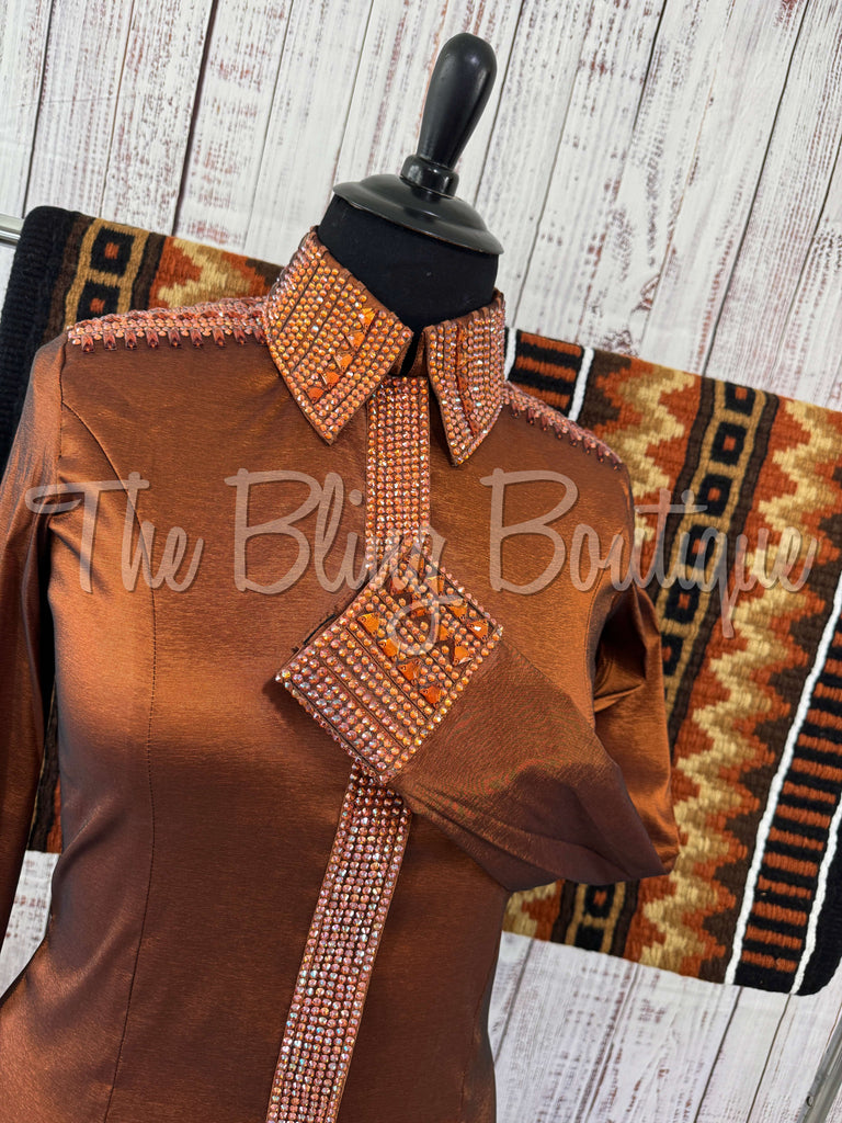 This gorgeous day shirt is absolutely stunning in person! The shirt is made from a stretch taffeta fabric and is covered in the highest quality of crystals that sparkle from every direction.