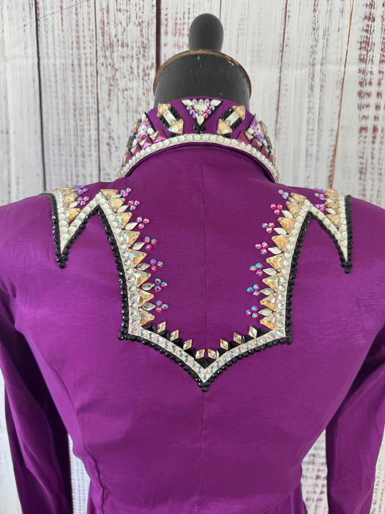This gorgeous day shirt is absolutely stunning in person! The shirt is made from stretch taffeta base and is covered in the highest quality of crystals that sparkle from every direction.