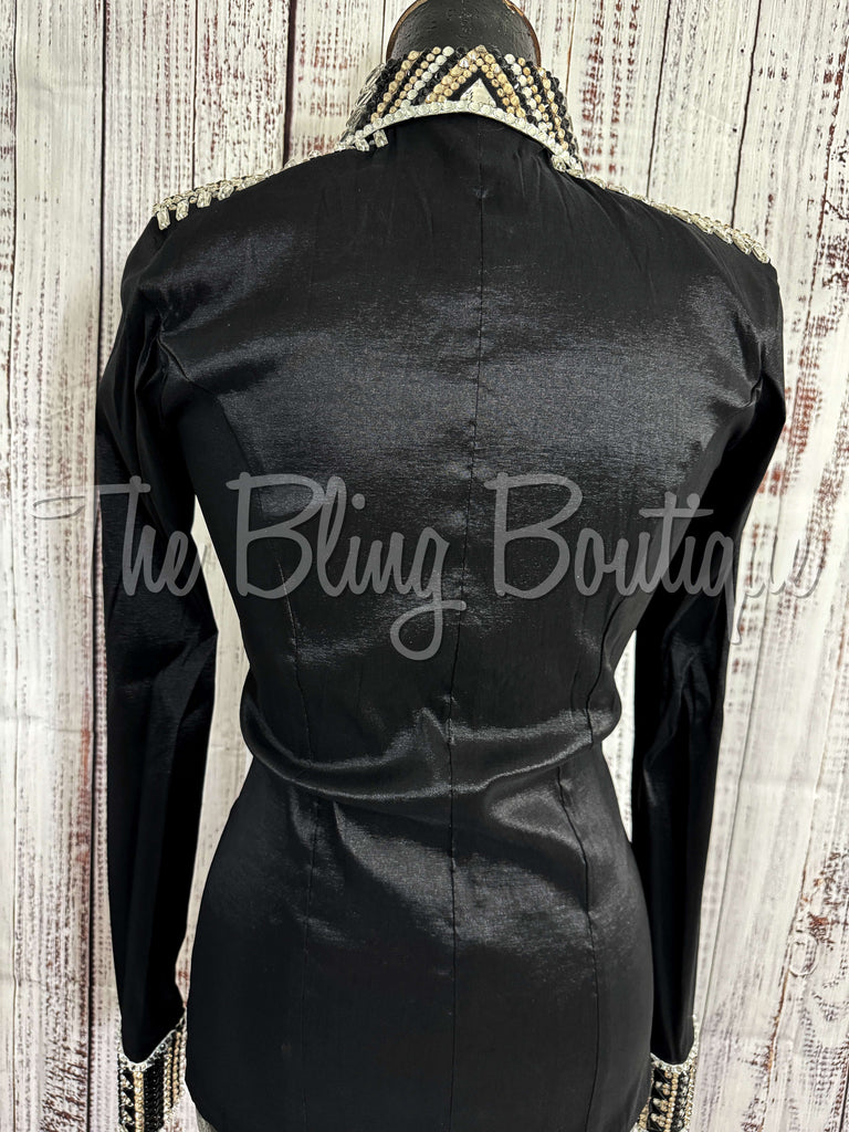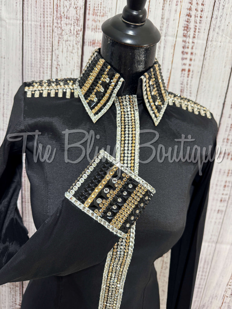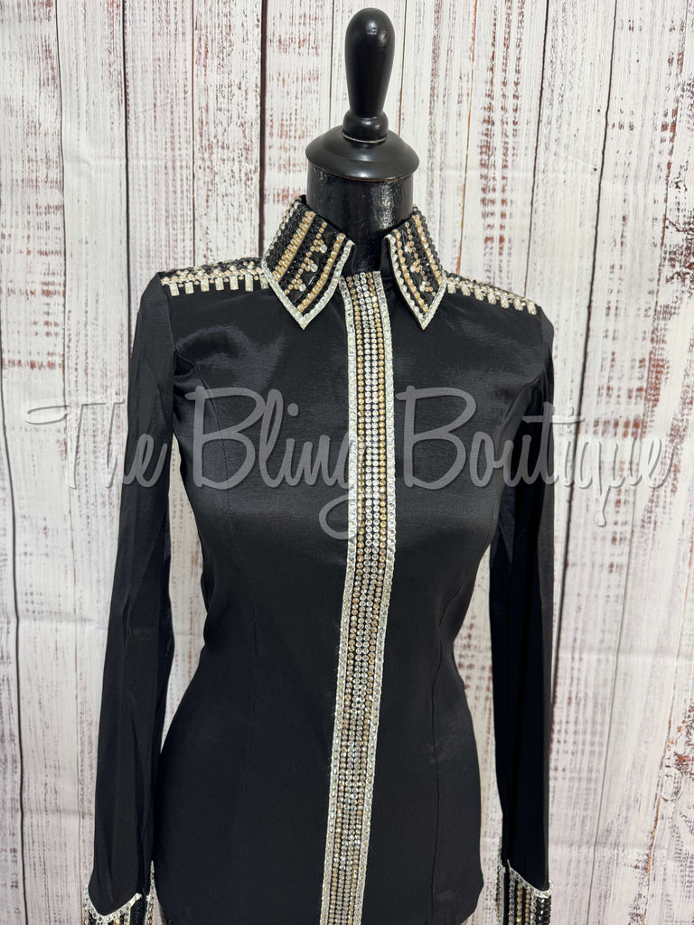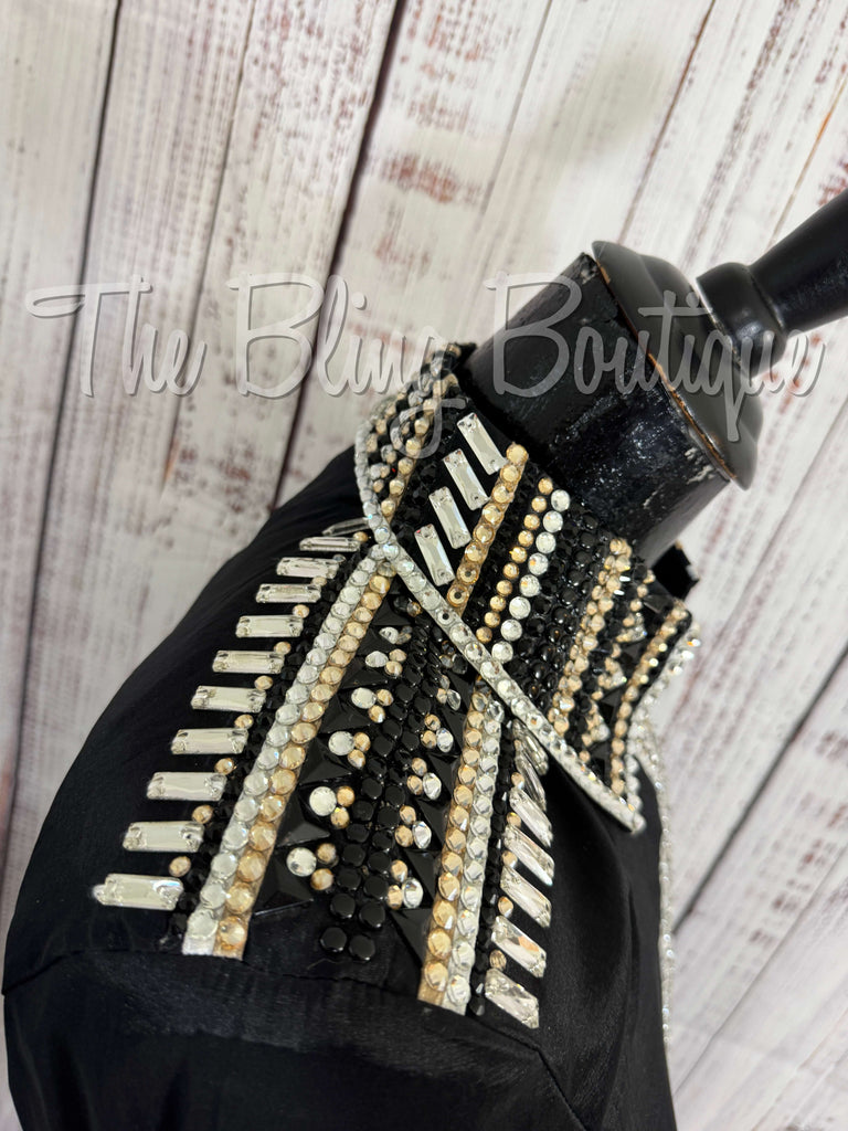 This gorgeous day shirt is absolutely stunning in person! The shirt is made from stretch taffeta base and is covered in the highest quality of crystals that sparkle from every direction.