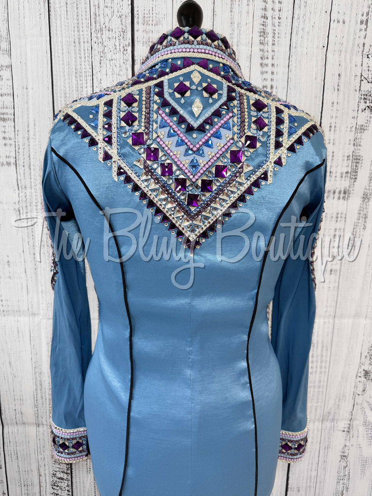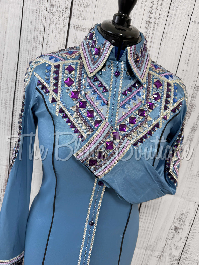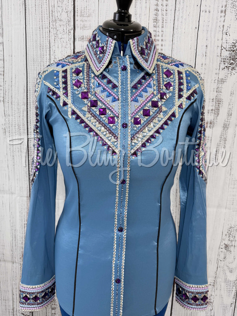 This gorgeous day shirt is absolutely stunning in person! The shirt is made from stretch taffeta base and is covered in the highest quality of crystals that sparkle from every direction.