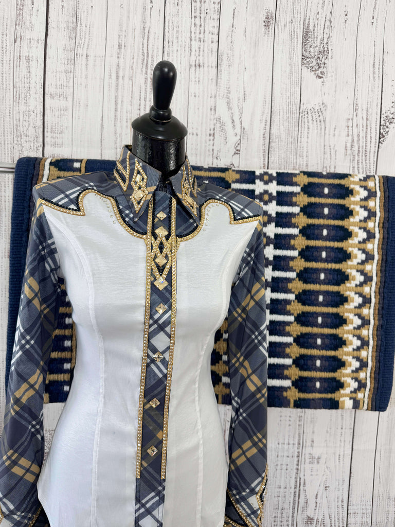 This gorgeous day shirt was custom made by DC Custom Label. It is absolutely stunning in person! The shirt is made from a white and plaid printed stretch taffeta base and is covered in the highest quality of crystals that sparkle from every direction.