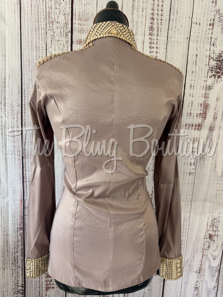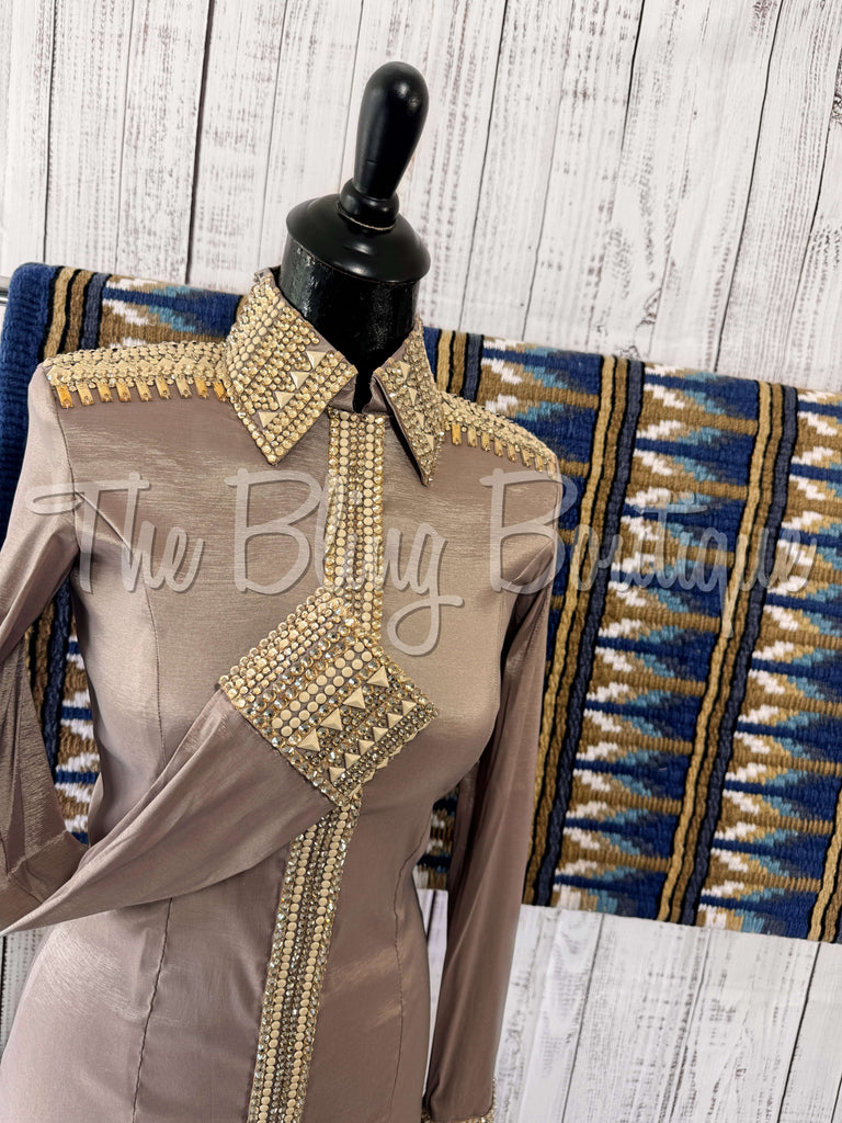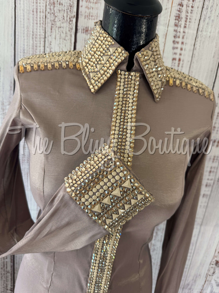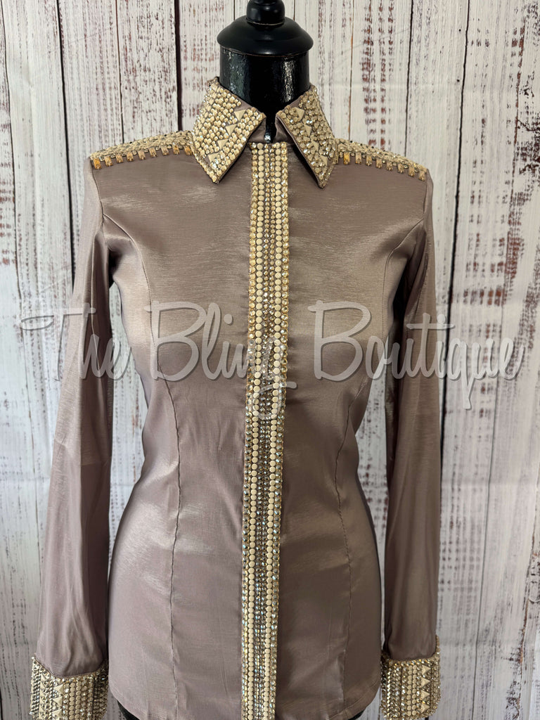 This gorgeous day shirt is absolutely stunning in person! The shirt is made from stretch taffeta base and is covered in the highest quality of crystals that sparkle from every direction.