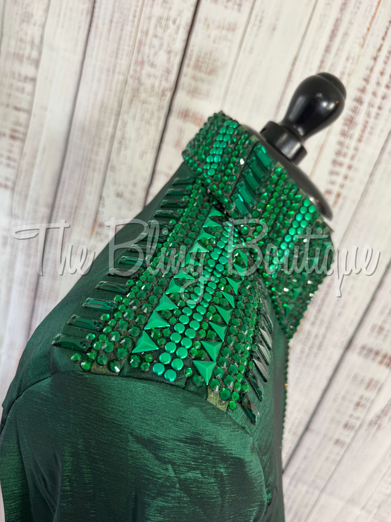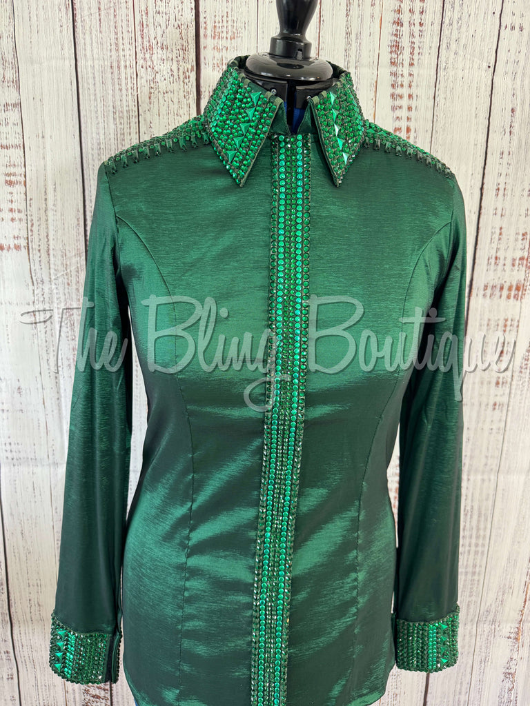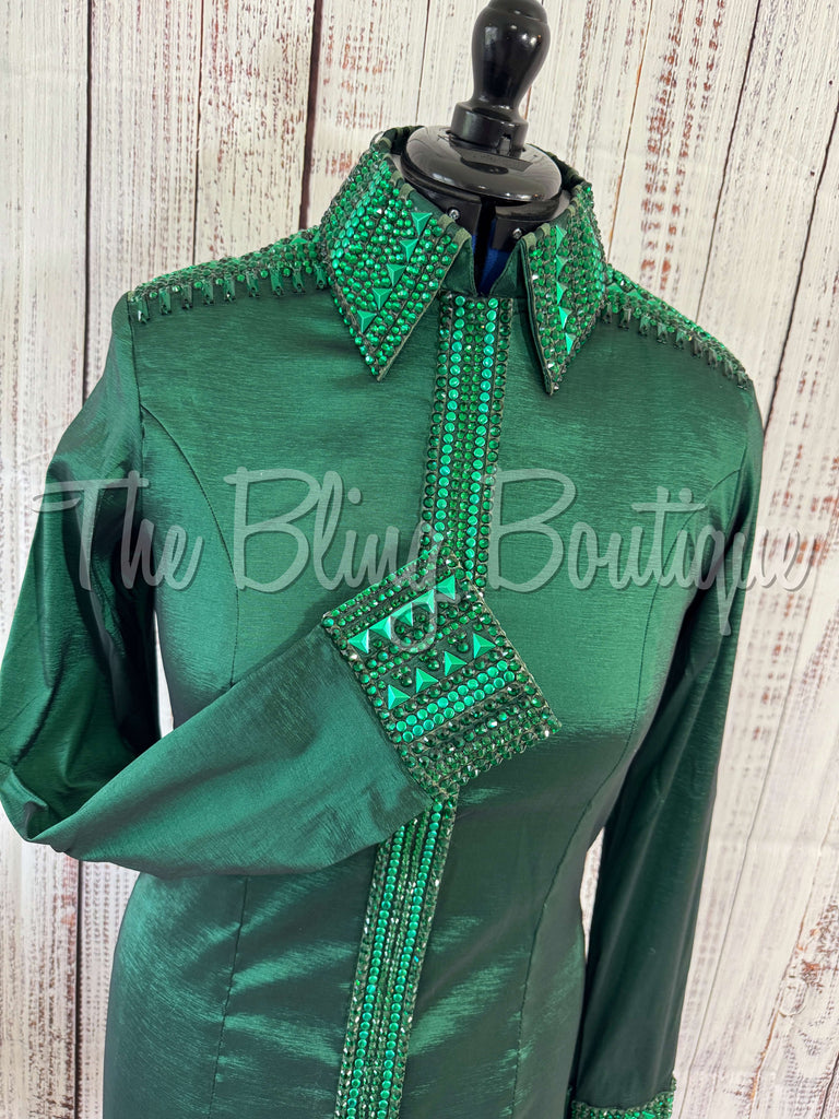 This gorgeous day shirt is absolutely stunning in person! The shirt is made from stretch taffeta base and is covered in the highest quality of crystals that sparkle from every direction.