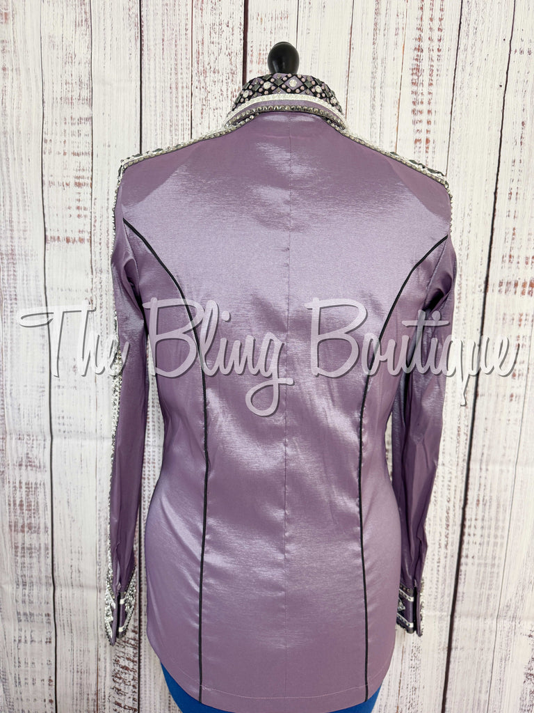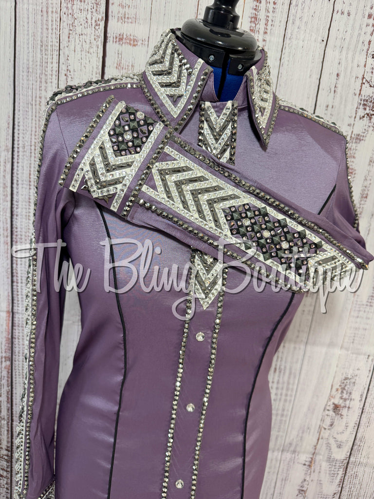 This gorgeous day shirt is absolutely stunning in person! The shirt is made from a stretch taffeta base and is covered in the highest quality of crystals that sparkle from every direction.