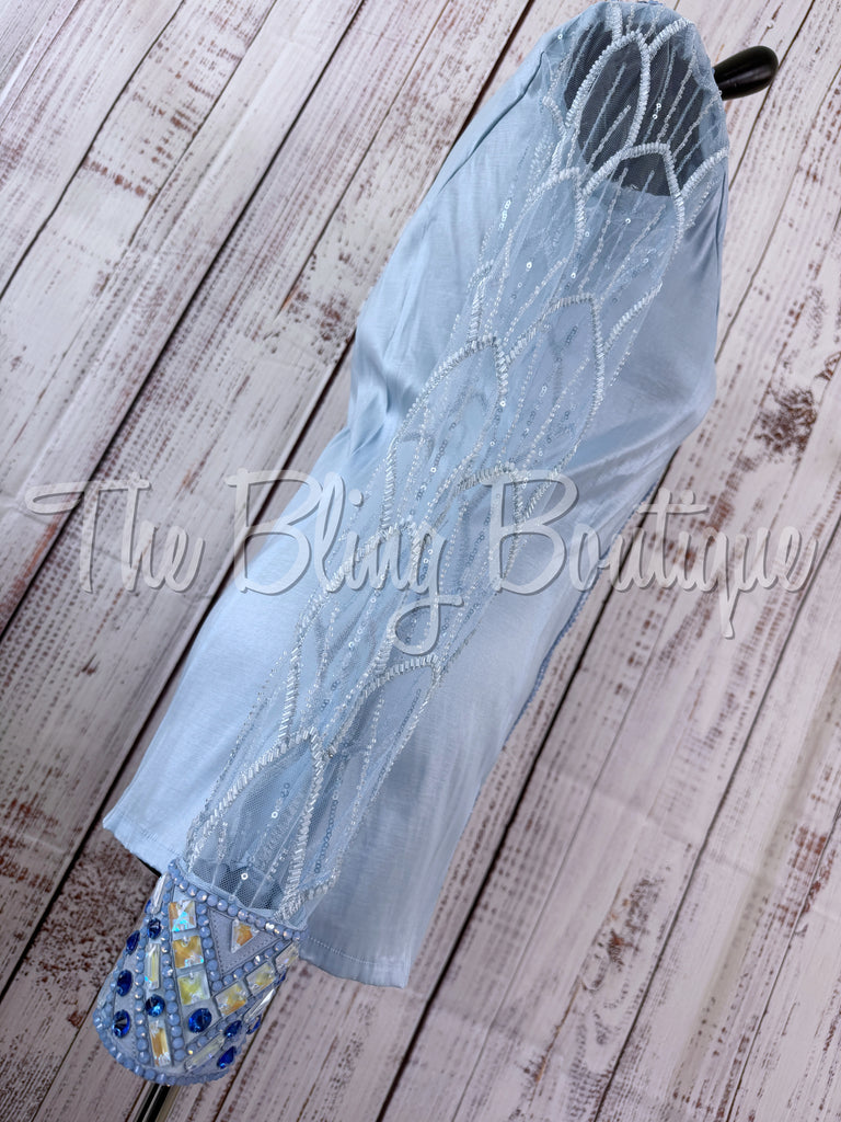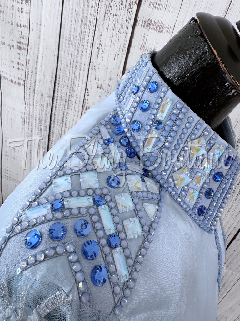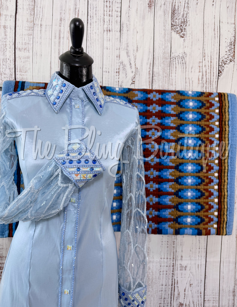This gorgeous day shirt is absolutely stunning in person! The shirt is made from stretch taffeta base and is covered in the highest quality of crystals that sparkle from every direction. This beautiful shirt features sheer, lace beaded sleeves that are perfect for the hot summer shows!
