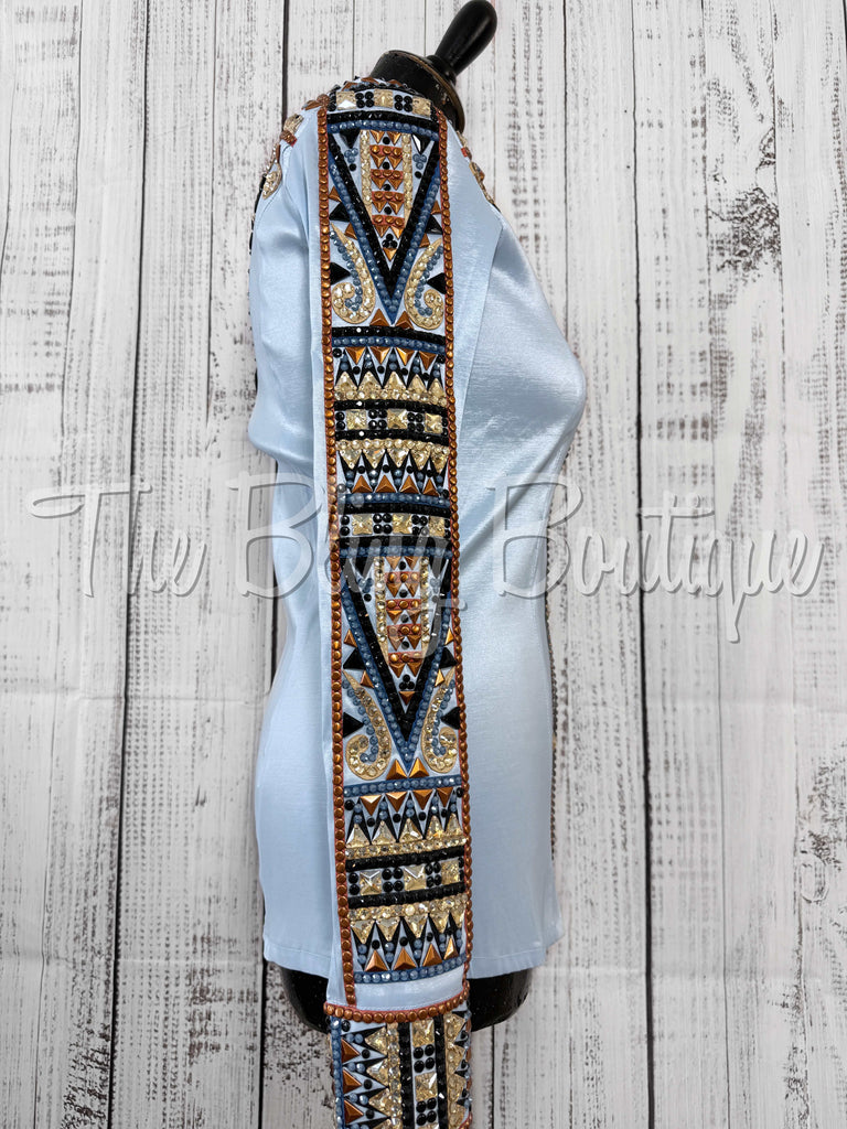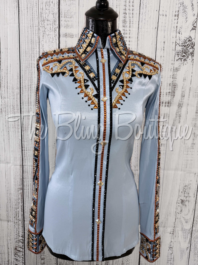 This gorgeous day shirt is absolutely stunning in person! The shirt is made from stretch taffeta base and is covered in the highest quality of crystals that sparkle from every direction.