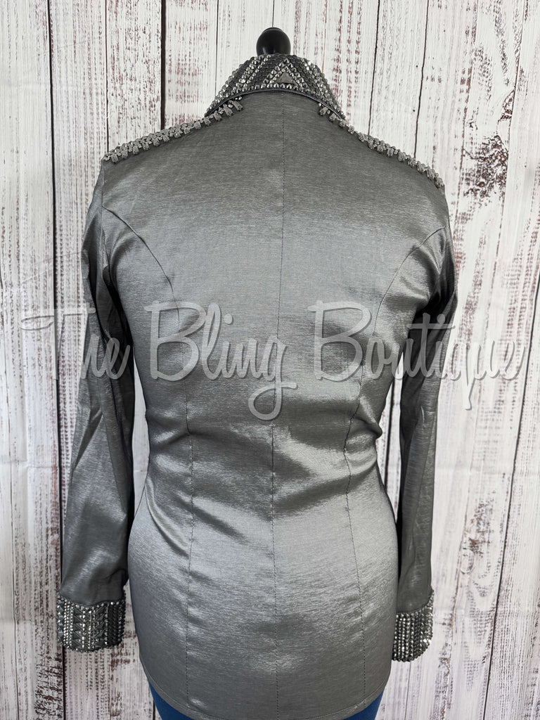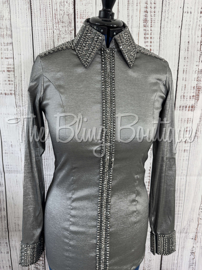 This gorgeous day shirt is absolutely stunning in person! The shirt is made from stretch taffeta base and is covered in the highest quality of crystals that sparkle from every direction.