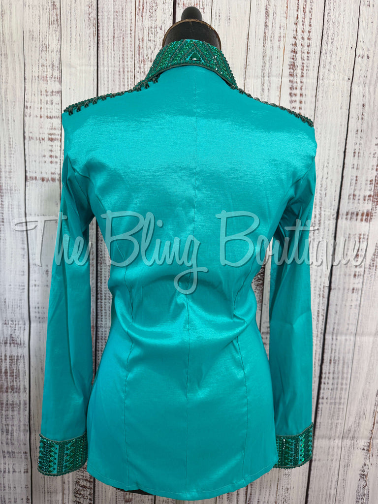 This gorgeous day shirt is absolutely stunning in person! The shirt is made from stretch taffeta base and is covered in the highest quality of crystals that sparkle from every direction.