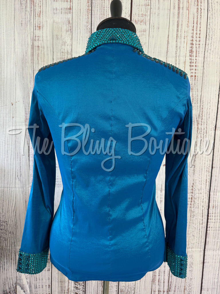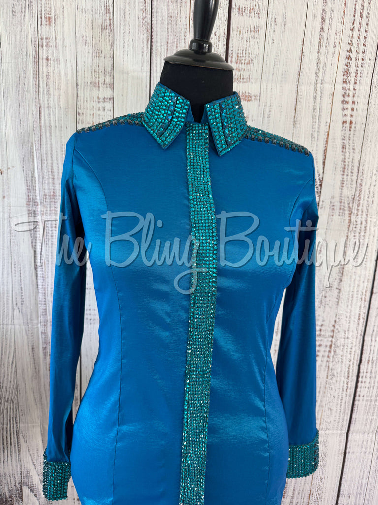 This gorgeous day shirt is absolutely stunning in person! The shirt is made from a stretch taffeta base and is covered in the highest quality of crystals that sparkle from every direction.