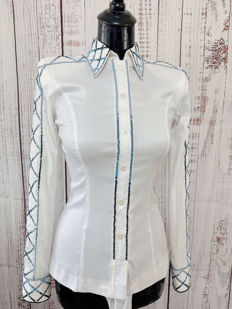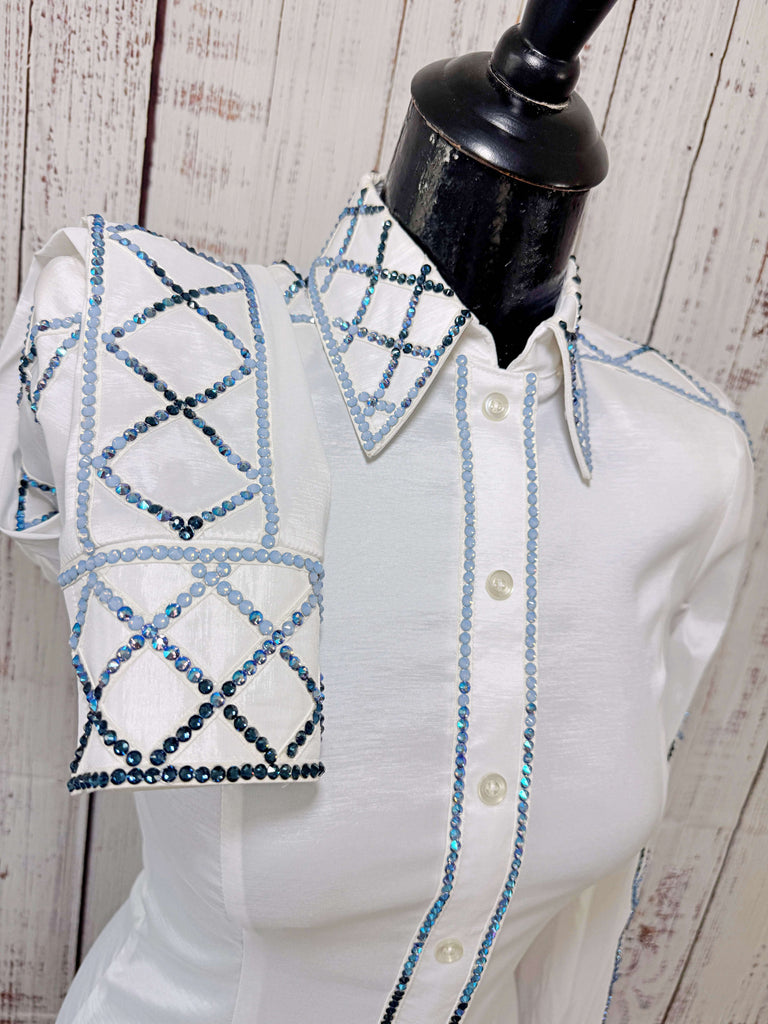 This gorgeous day shirt was custom made by Unbridled Couture. It is absolutely stunning in person! The shirt is made from stretch taffeta base and is covered in the highest quality of crystals that sparkle from every direction.