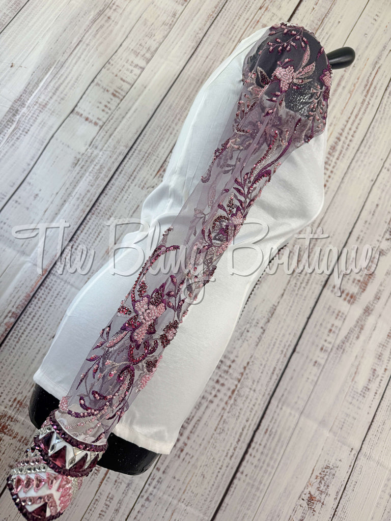 This gorgeous day shirt is absolutely stunning in person! The shirt is made from stretch taffeta base and is covered in the highest quality of crystals that sparkle from every direction. This beautiful shirt features sheer, beaded lace sleeves that are perfect for the hot summer shows!