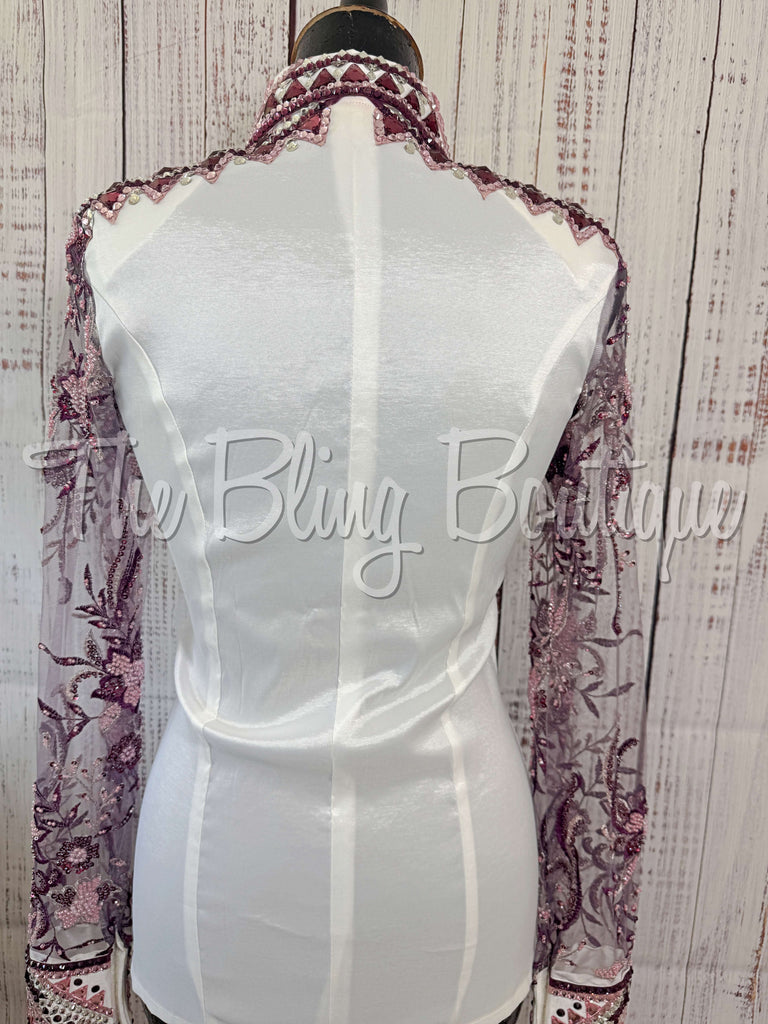 White, Plum & Lilac Day Shirt Set With Beaded Lace Sleeves (S)